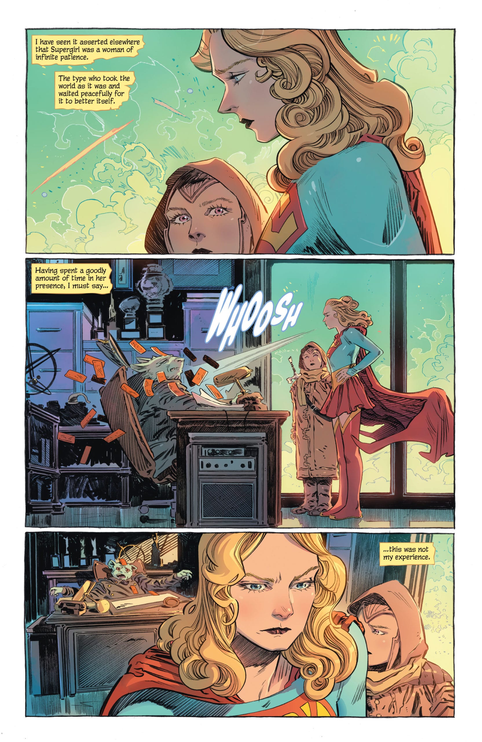 As good as the story was, though, I have to admit the thing that put the experience of reading it over the top had nothing to do with anything on the page, but instead had to do with sharing it with my three year old daughter, who I read much of it too. It’s the first time I’ve read a comic book story to her and I had no idea if she’d enjoy it or not, but she listened, looked at the pictures, and has started pretending to be Supergirl, calling our dog Krypto, and pretending she has a flying horse named Comet. She even asked me if Supergirl has a pet bear because she wanted to name my in-laws’ dog, who we jokingly refer to as “Slow Bear” after it, so I told her that she has a bear called Argo.
